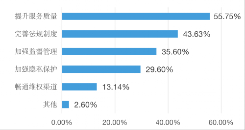 在改进建议方面,超过半数(55.75%)受访者建议“提升服务质量”,四成多(43.63%)受访者建议“完善法规制度”,三成多(35.60%)受访者建议加强监督管理。