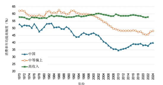 制约经济增长的主要因素转变,也对投资于人提出现实紧迫的要求。实现2035年成为中等发达国家所要求的增长目标,在需求侧面临的挑战比在供给侧更大,特别是居民消费能否得到有效提升,对于经济增长潜力的充分兑现具有决定性作用。根据世界银行数据库,2024年我国居民消费支出占GDP比重(消费率)为39.9%,中等偏上收入国家平均为48.2%,高收入国家(2022年)平均为57.8%。由此可以得出两个结论:一方面,我国居民消费率面临双重超越目标,一是与中等偏上收入国家平均水平趋同,差距约为8个百分点;二是向高收入国家平均水平赶超,即进一步缩小约10个百分点差距。另一方面,消费率趋同和赶超都是可以预期的目标。例如,从2010年到最近年份,我国消费率年均提高1.0%,而中等偏上收入国家和高收入国家分别降低了0.1%和0.2%(图2)。进一步加大对人力资本和民生的投资,有望进一步加快赶超速度,实现党的二十届四中全会设定的“居民消费率明显提高”目标。